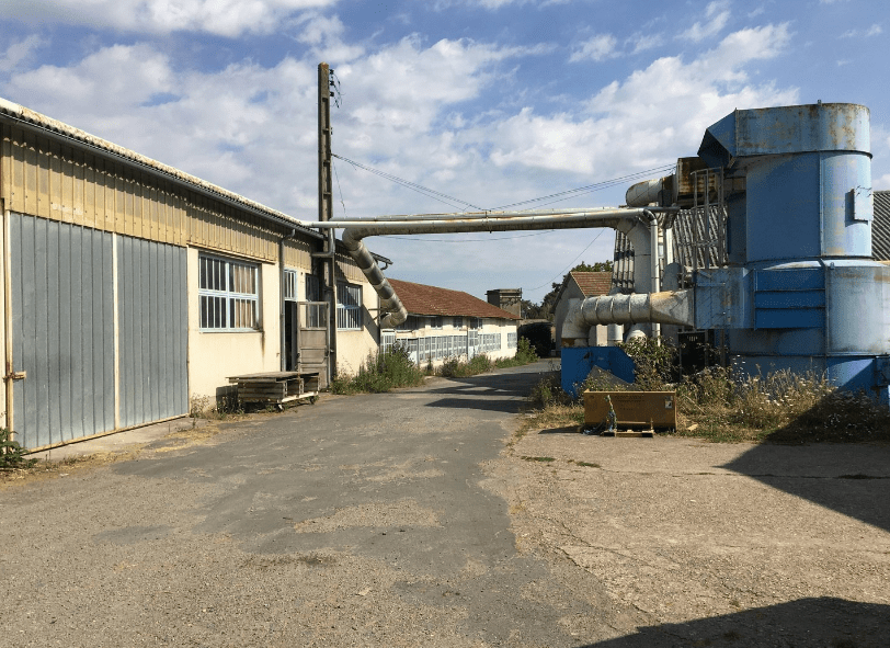 Opération de démolition des 6 bâtiments en superstructure de l’ancien site de production de l’entreprise Duvivier Canapés à Lussac-les-Châteaux.