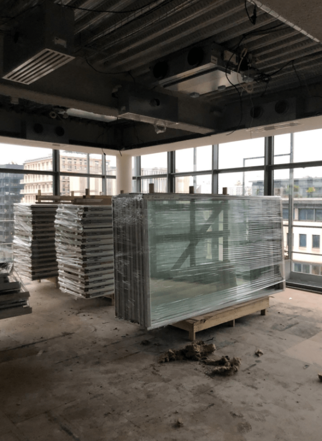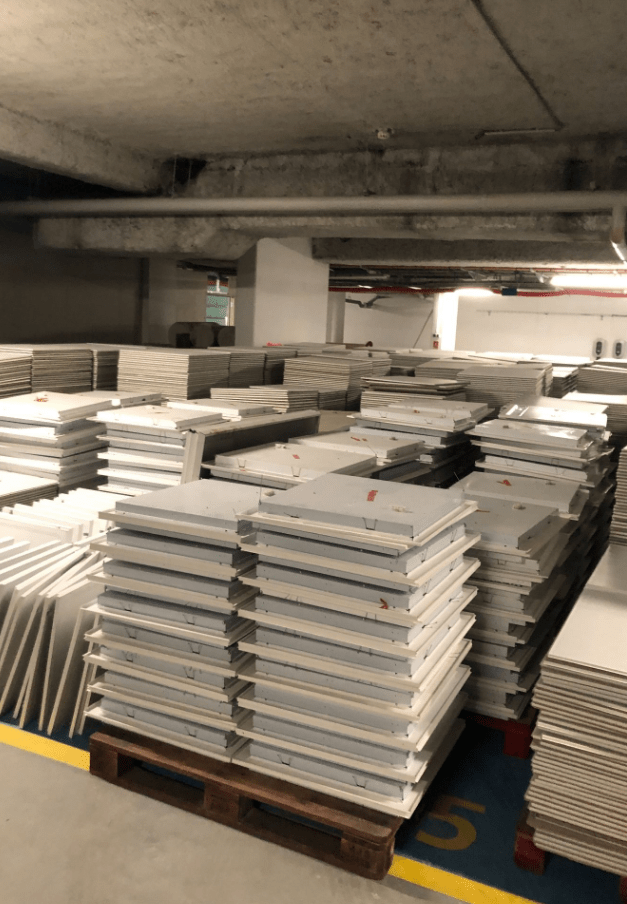 – Réemploi des moquettes, cloisons, menuiseries intérieures, équipements sanitaires, chemins de câble