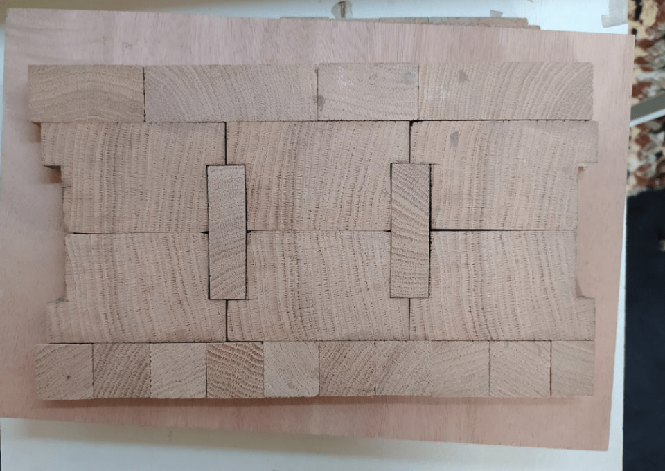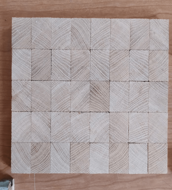 Réalisation de parquet en bois de bout à partir des montants des fenêtres du site en chêne.