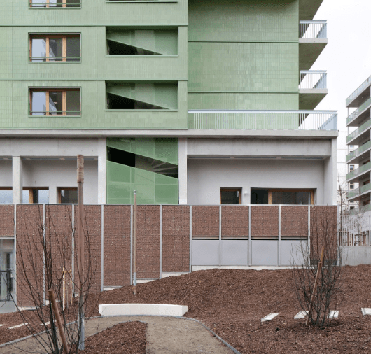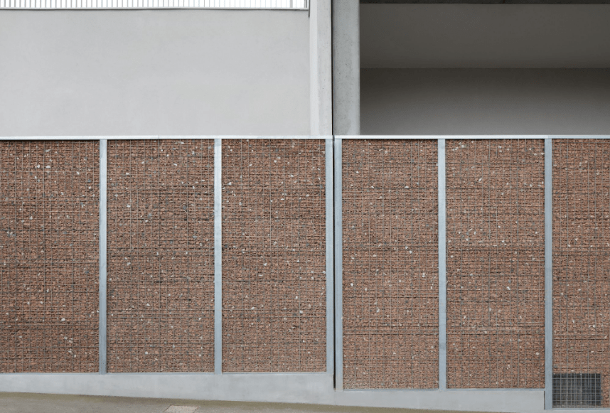R-USE n’est intervenu que sur la façade du socle (800 m2 / 3 à 6m de haut) réalisé en panneaux gabion fin (10 cm) remplis des chutes de production de terre cuite émaillées des façades ( Rairies Montrieux – fournisseur du projet) – 100 tonnes de terre cuite  mises en œuvre
